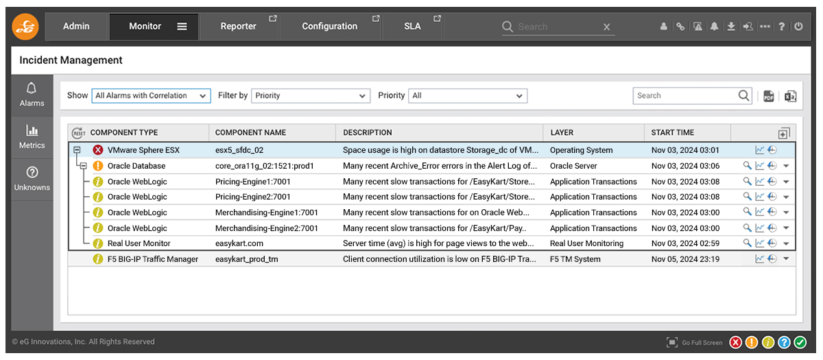 Figure 3: Alerts are correlated, prioritized and groups to avoid alarm storms and to ensure primary issues rather than secondary issues are addressed - Automated Remediation: In addition to intelligent alerting with proper RCA, eG offers automated remediation with corrective scripts for frequently occurring issues. By this way, many issues can be resolved without human intervention, further reducing the noise and allowing team to focus on higher-priority tasks.