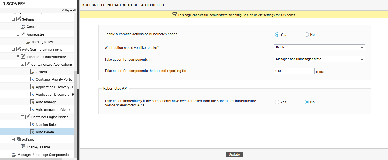 Select the Auto Delete option under the Kubernetes Infrastructure sub-node of the Auto Scaling Environment sub-node of the Agent Discovery node in the discovery tree. The right panel will change to display a Kubernetes - AUTO DELETE page (see Figure 1).