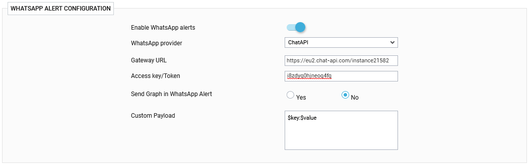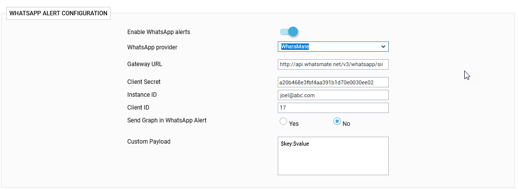 Figure 11 : Enabling WhatsApp alerting using a gateway provider