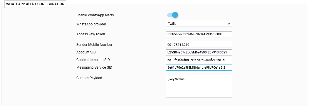 Figure 12 : Configuring WhatsApp Alerting using Twilio