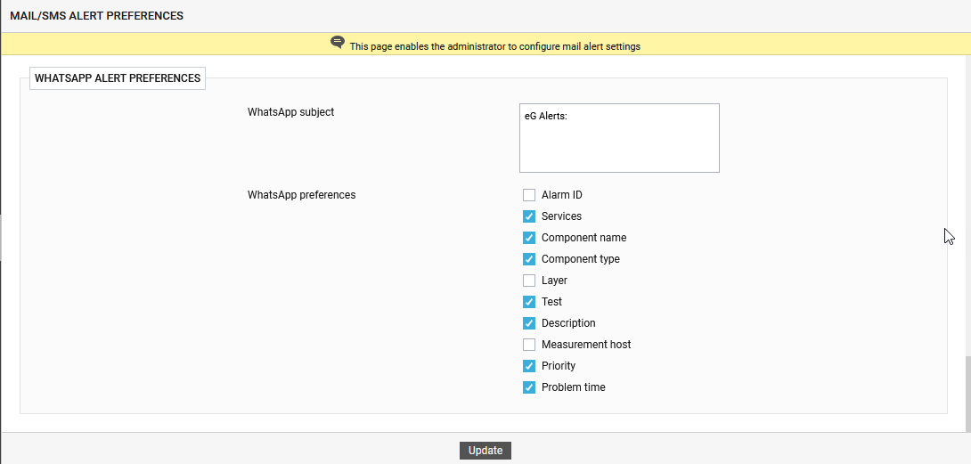 If the Show last measure value in mail alerts flag in the MAIL/SMS ALERT CONFIGURATION section is set to Yes, then the Test and Description check boxes against Mail preferences will be automatically deselected. This means that if you choose to include the problem measure value in your email alerts, then the test name and descriptor will by default be included in those alerts. On the other hand, if you choose not to include the last measure value in the email alerts, then you have the option to/not to include the problem test name and/or descriptor in the email alerts.