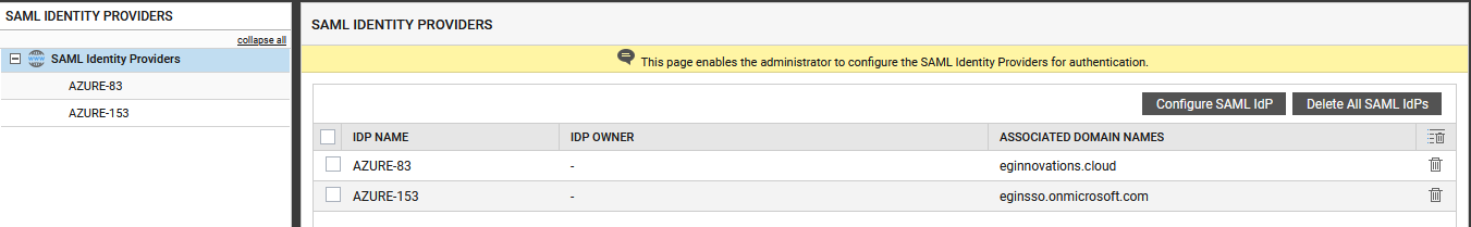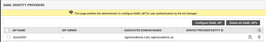 Figure 39 then appears, listing all the IdPs (if any) that pre-exist in the eG Enterprise system. To create a new IdP, click the Configure SAML IdP button in Figure 39.