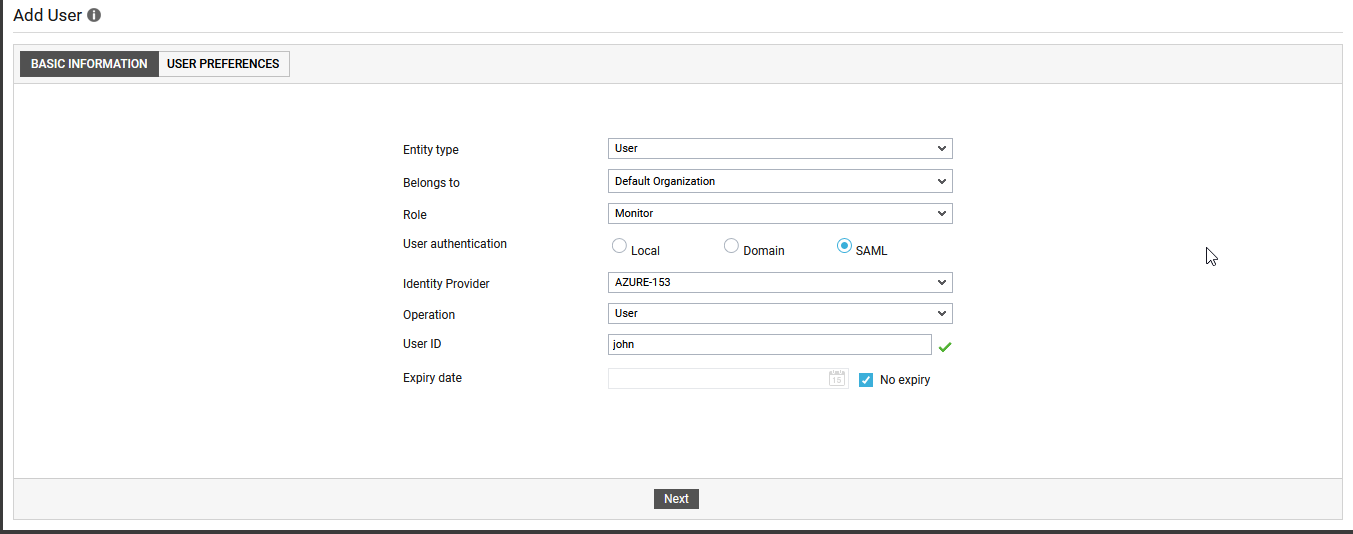 When adding a user, choose the User role. Then, set SAML as the User authentication mode (see Figure 44).