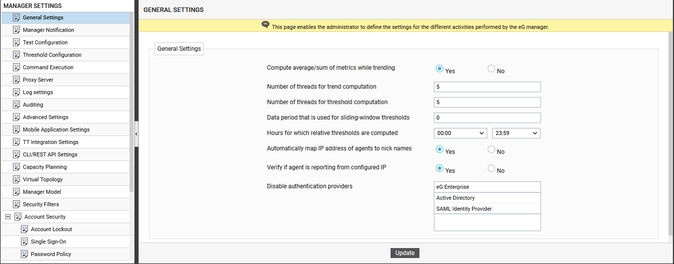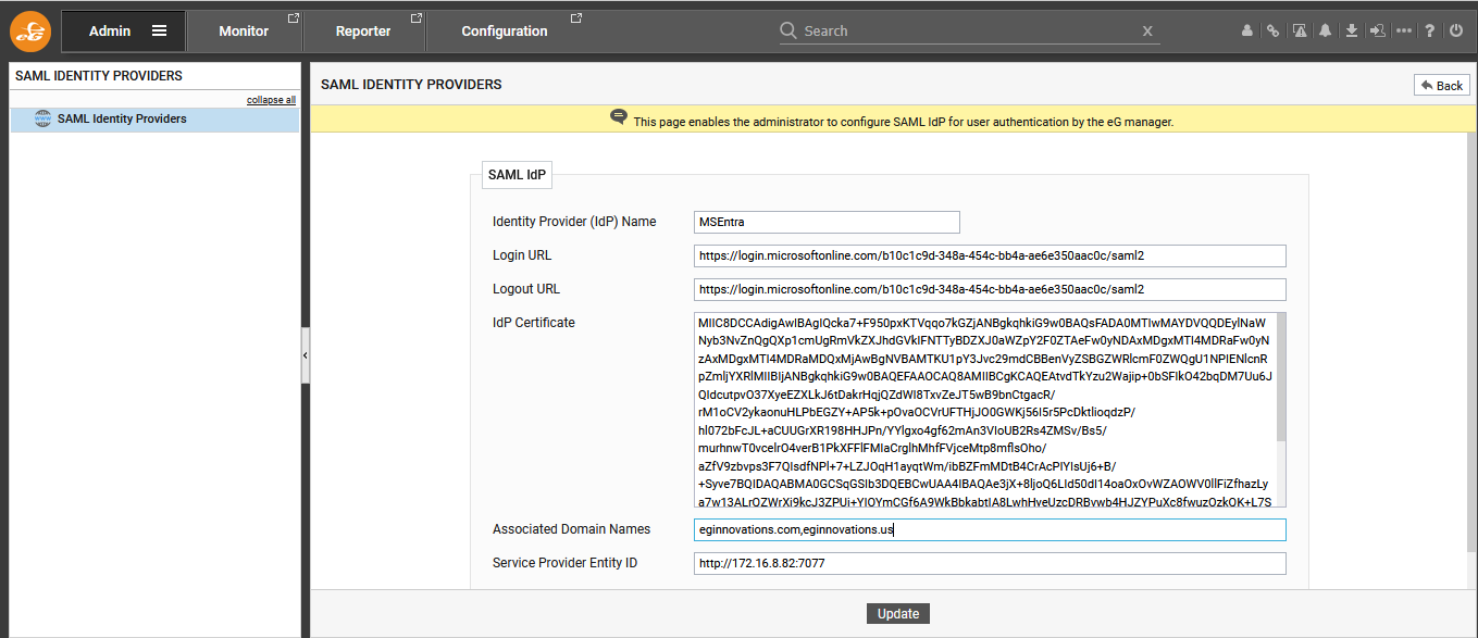 - From the Disable SAML Identity Providers list, select the IdPs that you want to disable. The unselected IdP will be automatically enabled. For instance, to set SAML Identity Provider as the IdP, select the eG Enterprise and Active Directory options in Figure 14, so the selection is automatically disabled, and SAML Identify Provider is enabled. Finally, click the Update button.