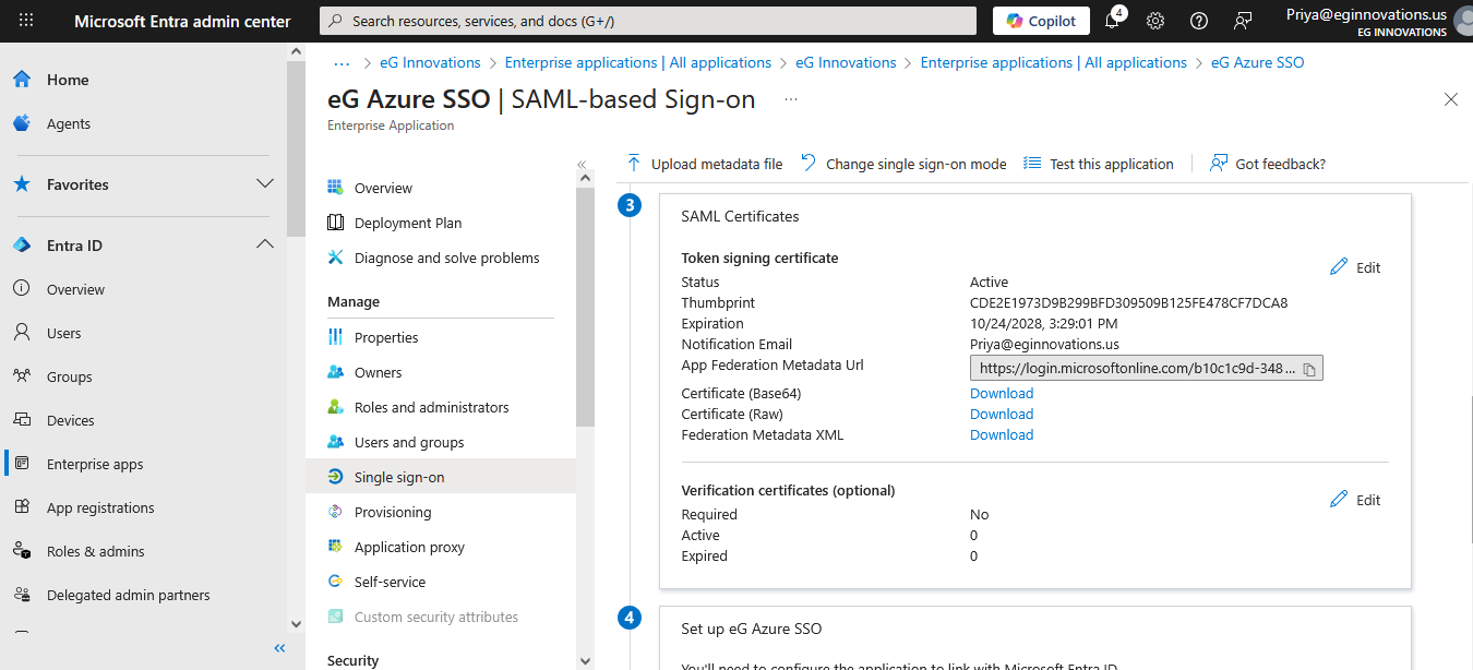 Then, configure the IdP Certificate. When registering eG Enterprise as an SP with the target IdP, the IdP will issue a trusted X.509 certificate for the eG manager. Copy the contents of that certificate and paste it here. If Microsoft Entra is being configured as the IdP for the eG manager, then you first need to download the certificate. This can be achieved only when configuring SAML-based sign-on for the custom application you create on Microsoft Entra. This procedure has been explained in detail in the previous section. When you reach step 7 of that procedure, you will find that a Set up Single Sign-On with SAML page opens (see Figure 27). Scroll down that page until the SAML Certificates section becomes visible (see Figure 41).