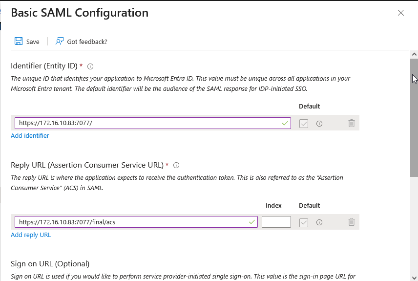 Figure 40 then appears. Here, first specify the Identify Provider (IdP) Name. Then, specify the Login URL of the IdP. If Microsoft Entra is the IdP, then make sure you specify the Login URL displayed in Figure 28 here.