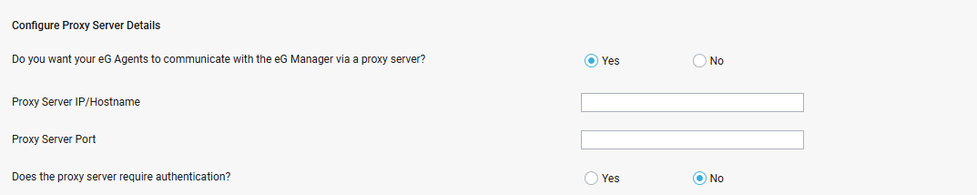 Configure Proxy Server Details: By default, the eG agent will communicate directly with the eG manager. However, in some environments, the eG agent may be required to communicate with the eG manager via a Proxy server. To enable the eG agents to communicate with the eG manager via a Proxy server, set the Do you want your eG Agents to communicate with the eG Manager via a Proxy server? flag to Yes(see Figure 6). Provide the IP/host name and port number of the Proxy server that the eG agent should use in the Proxy Server IP/Hostname and Proxy Port text boxes, respectively.