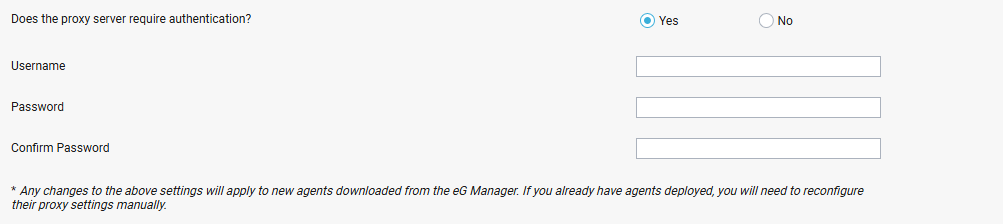 If the Proxy server requires authentication, then set the Does the Proxy server require authentication flag to Yes (see Figure 5). If the Proxy server requires authentication, then specify the credentials of a valid Proxy user against the Username and Password text boxes. Confirm that password by retyping it in the Confirm Password text box.