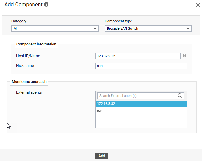 Specify the Host IP/Name and the Nick name for the Brocade SAN Switch component.