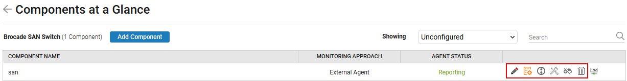 After adding a Brocade SAN Switch component, you will be redirected to the Components page (see Figure 2). Using the options provided in the Components page, you can modify, unmanage or delete the newly added component. In addition, you can also configure the tests, set thresholds and maintenance policies, and change the IP address.