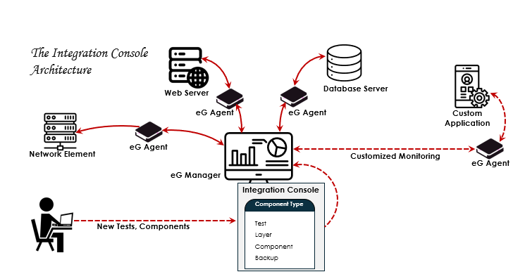 A test is an object that is invoked by an eG agent periodically to report measures pertaining to a particular component (e.g., web server, network router, database, etc.). These tests can report performance metrics or the configuration information pertaining to the monitored targets. New tests can be added and configured for use by the eG agents using the Integration Console. To enable an agent to implement the new test(s), the Integration Console includes a mechanism through which the agents can automatically discover the addition of new tests to the eG Enterprise system and can enhance their capabilities to start performing the new tests.