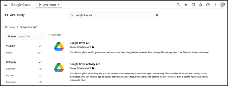 This will lead you the API Library page where you can view a list of APIs of available Google Workspace services. To find out the API of a service that you wish to monitor, you can specify whole or part of the service's name and as shown in Figure 10.