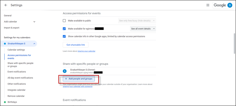 This will invoke a list of settings, from that select Share with specific people or groups options. Then, click on Add people and groups to share the simulation user’s calendar with the Service account, refer Figure 19.