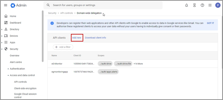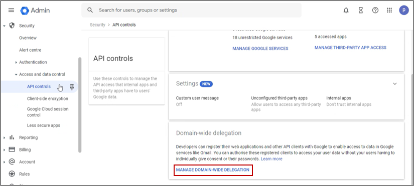 Now, navigate through the menu sequence, Security -> Access and data control -> API Controls. Then, click Manage Domain-Wide Delegation under Domain-wide Delegation,, see Figure 21.