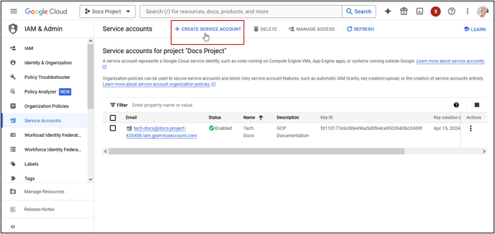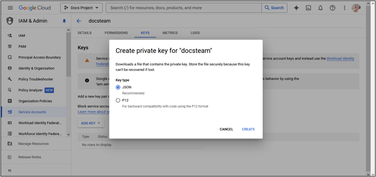 When you create a service account in any of the projects in GCP, to authenticate API requests, you need to create a private key for the service account in the form of a JSON file. The private key file includes information such as email address, unique identifier (private key ID), and the private key of the service account. To download the key associated with the created service account, do the following: