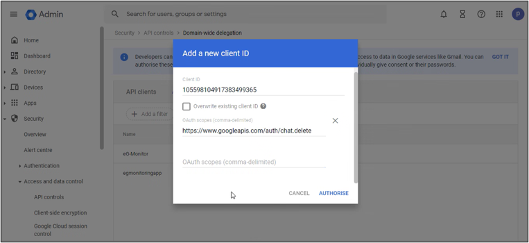 In the box that appears, as in Figure 23, specify the Client ID available in the Private Key file. In the OAuth Scopes field, Specify the following OAuth scopes:
