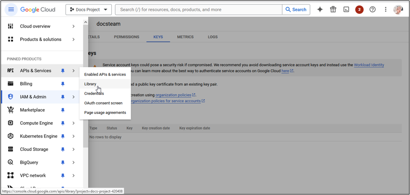 Navigate to IAM & Admin → Service Accounts, choose the service account for which you want to download the key in the list of service accounts. Click on the service account name to open its details.