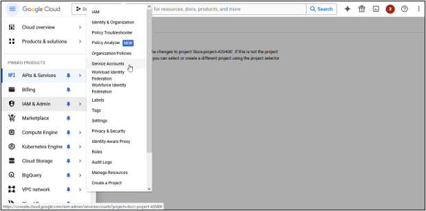 In the Google Cloud Console, go to IAM & Admin, then select the Service Accounts option from the IAM & Admin tree in the left-side navigation menu as shown in Figure 2.