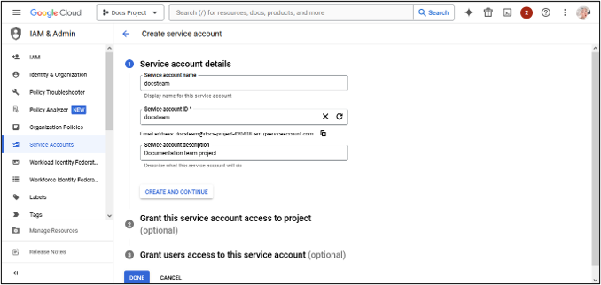 Next, you will be prompted to grant permissions to the service account in the Grant this service account access to project section. Click Continue and then Done. If you want the service account to have access to specific resources, you can specify these permissions in the Grant users access to this service account section.