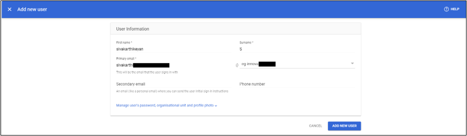 To perform simulation of certain operations (such as Chat, Classroom and Calendar) on Google Workspace, you may need a simulation user. You can either use an existing user or create a new simulation user. To create a new user, follow the steps given below: