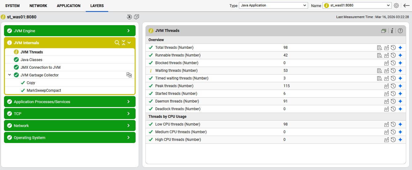 Whenever a thread goes into waiting, the value of the Waiting threads measure reported by the jvm Threads test mapped to the jvm Internals layer gets incremented by 1 (see Figure 1).