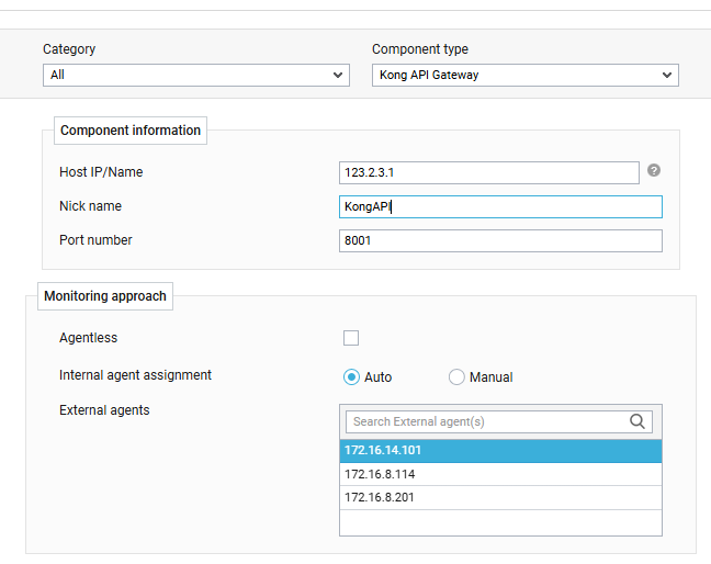 Next, select the External agent that will monitor the target Kong API Gateway component.