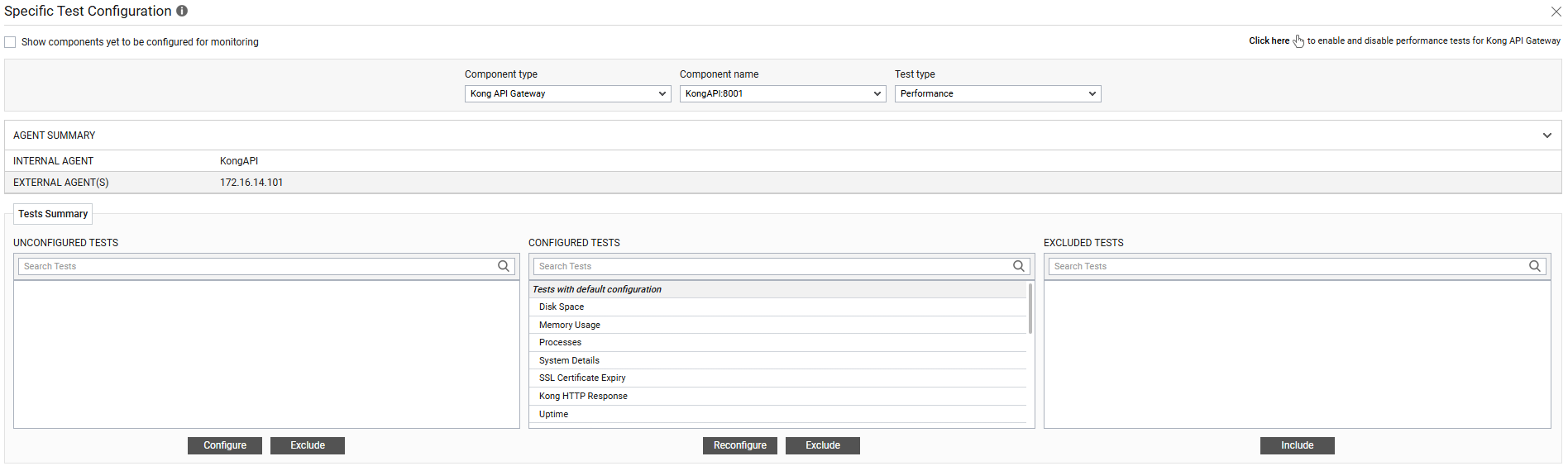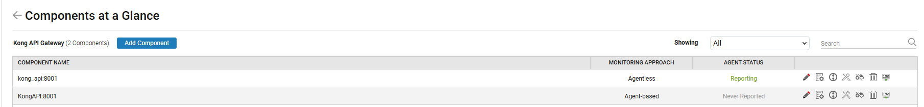 Once the Kong API Gateway component is added successfully, you will be again redirected to the Components page (see Figure 2). Using the options provided in the Components page, you can modify, unmanage or delete the newly added component. In addition, you can also configure the tests, set thresholds and maintenance policies, and change the IP address.