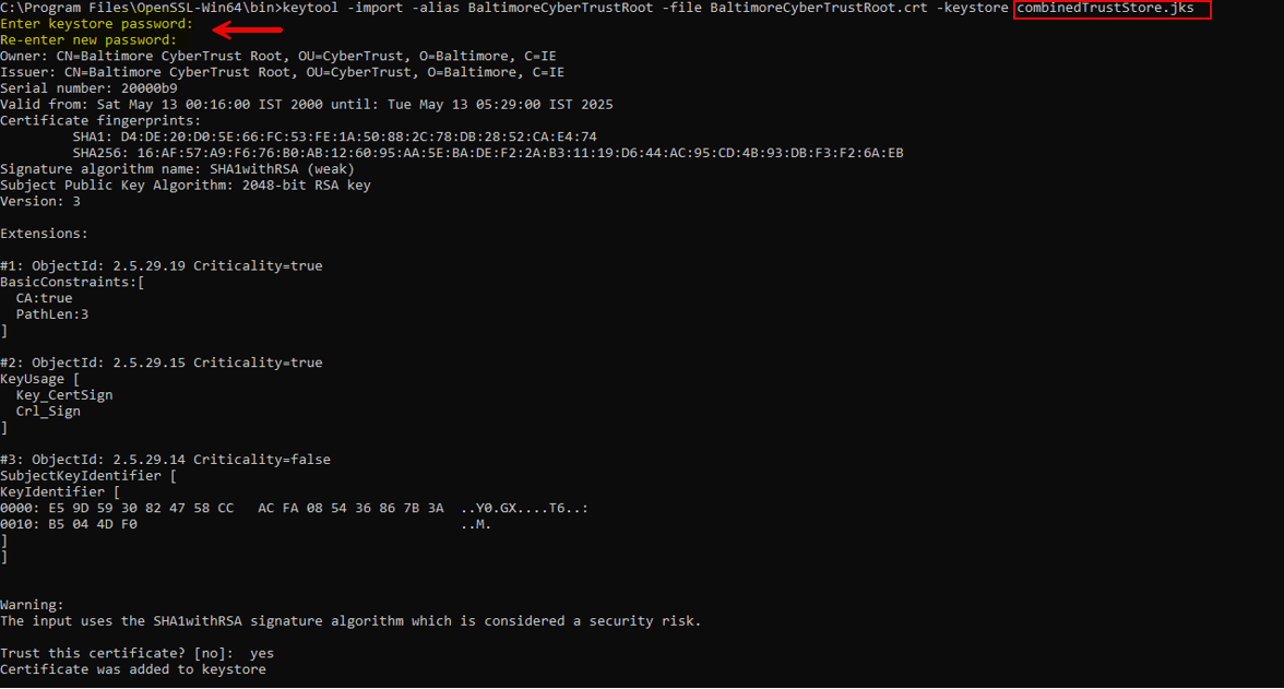 Figure 4 : Importing BaltimoreCyberTrustRoot.crt into combined truststore