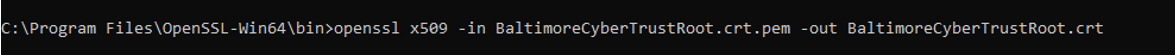 openssl x509 -in BaltimoreCyberTrustRoot.crt.pem -out BaltimoreCyberTrustRoot.crt