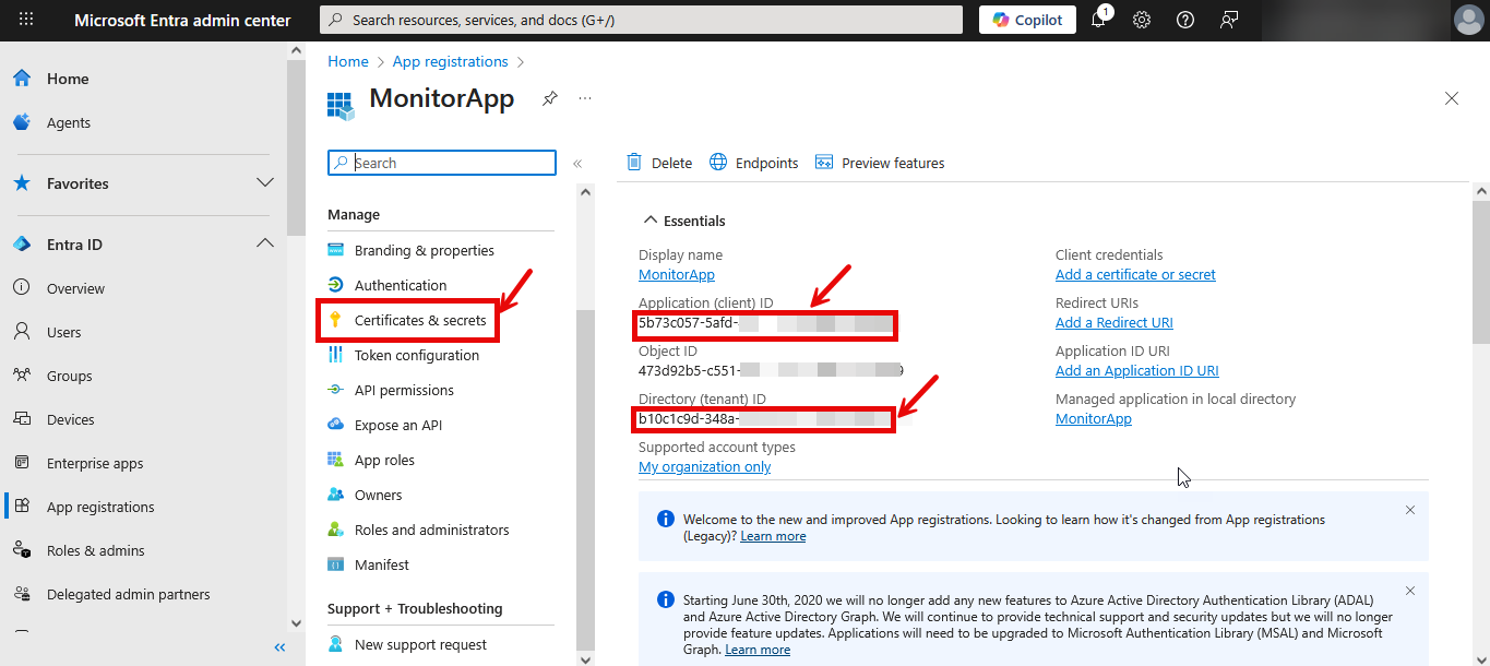 Determine the Tenant ID, the Application (Client) ID and Secret Key value associated with the registered Application;