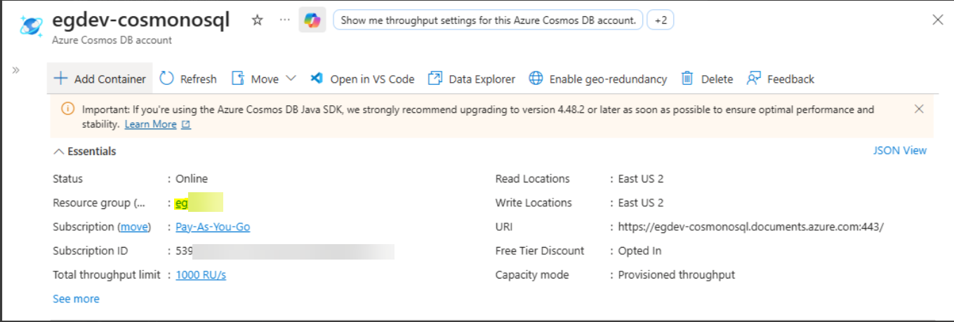 Resource Group Name – A named container in Azure that holds and organizes related resources like Cosmos DB. Resource group name is required for monitoring and alert configuration, RBAC access control, automation scripts, CLI, cost management etc.
