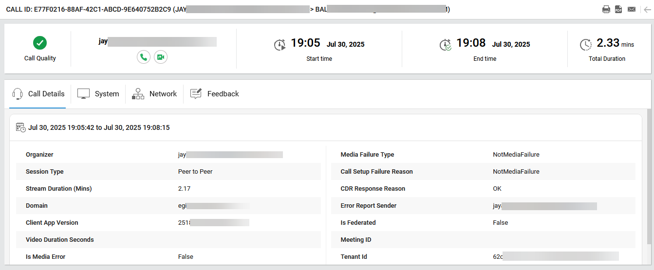 This page provides a summary of an individual Microsoft Teams peer-to-peer call, call quality status, start and end times, total and stream duration, and other details such as domain, client version, and tenant ID. This page also reveals whether there were media or setup failures and if the call was not federated. Likewise, Network, System and Feedback tabs display the device-level details about the participant’s hardware and software, network-related statistics for the call and user-submitted ratings and comments (if any), respectively.