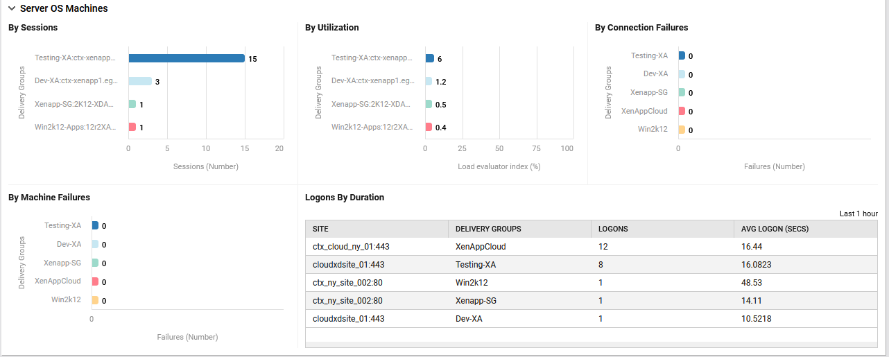 The Desktop OS Machines section provides administrators with a consolidated view of session activity and system health across different delivery groups that deliver desktop OS machines. The By Sessions bar chart graphically displays the number of active sessions per group, allowing quick identification of heavily used desktops. The By Utilization, By Connection Failures and By Machine Failures bar charts reveal details on overall machine utilization, connection failures, and machine failures, helping administrators to spot issues that could impact user experience. Additionally, it tracks logon activity over the last 1 hour, showing both the number of logons and the average logon duration for each delivery group.