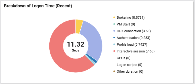 The Logon Time (Recent) section reveals the time duration taken by the users to establish the sessions during the last 10 minutes. Clicking on the doughnut chart provided in this section will lead you to the User Experience Overview dashboard that highlights the users whose logon duration was high.