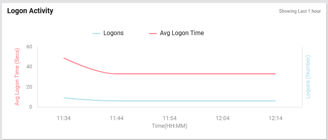 The Logon Activity section displays a graph that shows the exact time at which the number of users logged in and the average time taken by the users to login during the last one hour. By merely looking at this graph, administrators can identify the exact time at which logins to the target VDI server took too long and when exactly maximum number of users logged into the server.