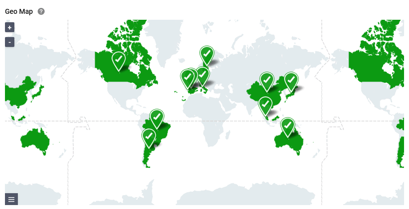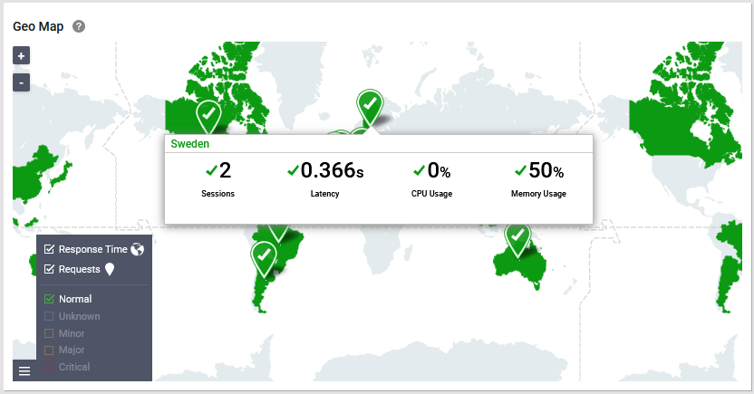 To analyze user experience geographically, use the Geo Map section of the dashboard. The Geo Map in Figure 3 quickly tells you where your users are from. Location markers accurately pinpoint the countries from which the users have established sessions on the target server. The size of the location marker varies according to the number of sessions established by the users of each country - i.e., larger the marker, higher will be the number of sessions from that country. Also, to indicate the experience of users from a country, both that country and its corresponding marker are colored using conventional color-codes. This way, the map intelligently differentiates between the “happy” countries and the “unhappy” ones.