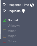 At any given point in time, you can choose to view only the request indicators - i.e., the markers - or the response time indicators - i.e., the countries colored using conventional color-codes - in the map. For instance, to hide the markers, click on the button below the map, and uncheck the Requests check box. To hide the colored countries, uncheck the Response time check box (see Figure 4).