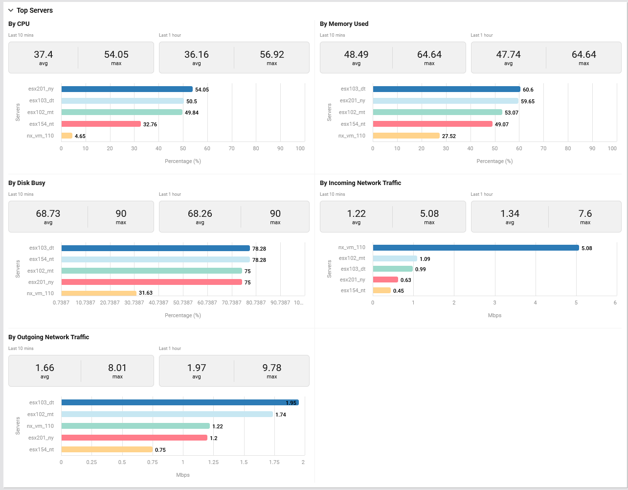 The Top Servers section provides a series of bar charts based on the CPU and memory utilization on the servers, incoming and outgoing traffic on the servers, and the how much the disks on the servers are busy in processing the requests. Clicking on the bars provided in the bar charts will lead you to the layer model page where the metrics related to the CPU and memory utilization, incoming/outgoing traffic and disk are recorded.