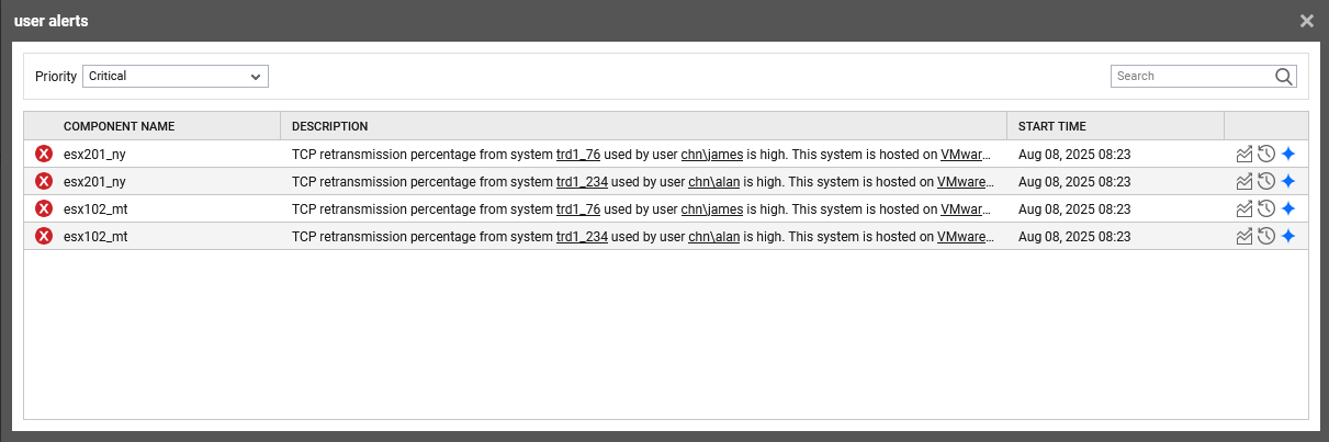 The User/Desktop Alerts section offers detailed insights into where exactly the user experienced issues while accessing the target VMware vSphere VDI server - is it during session start-up? or is it during user logins? or is it an issue with the user's browser? or is it while establishing sessions? etc. The User/Desktop Alerts lists the exact test/measure combination that was responsible for an alert generated for users. Also, the count of Critical/Major/Minor alerts generated for the users are also reported for each test/measure combination. This will help administrators identify the exact issue and initiate troubleshooting at the earliest.