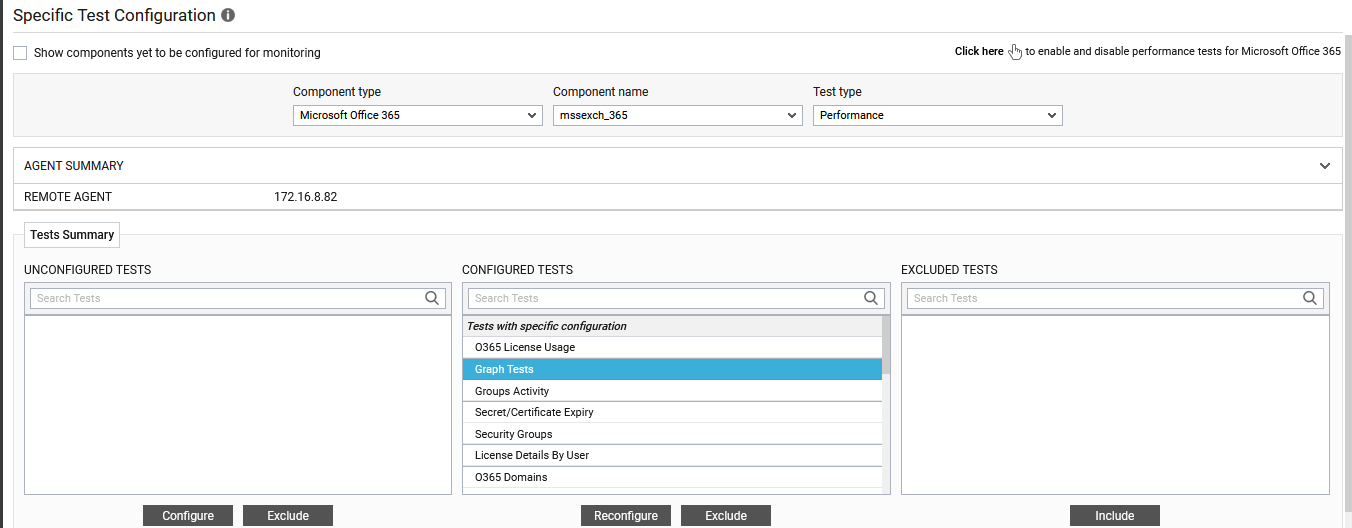 Figure 4 will then appear. Here, select Microsoft Office 365 (or any monitored Office 365 product) as the Component type, and select the monitored Component of that type. Upon doing so, all the fully-configured tests of the chosen component will be displayed in the CONFIGURED TESTS list box. From this list, select the Graph Tests test, as indicated by Figure 4, and click the Reconfigure button.