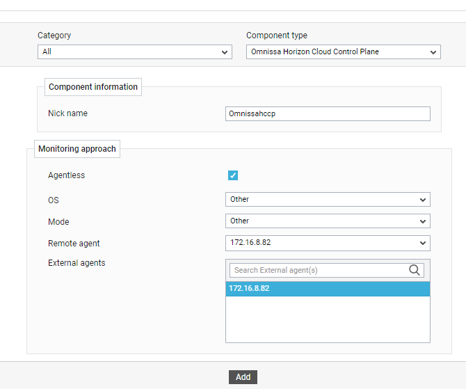 In the page that appears next, select Omnissa Horizon Cloud Control Plane as the Component type. Then, click the Add New Component button.