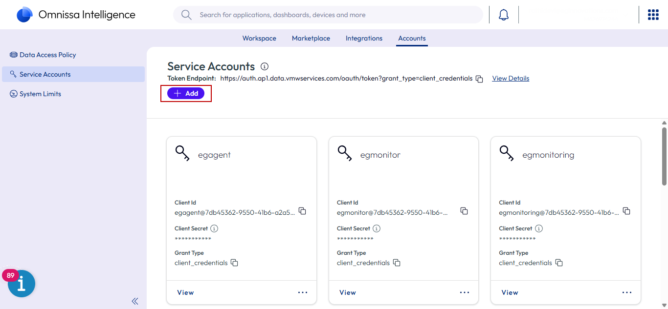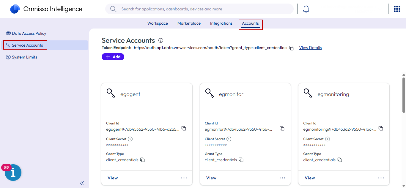 In Omnissa Intelligence page, click the Accounts tab and then select the Service Account menu in the left panel (see Figure 3).