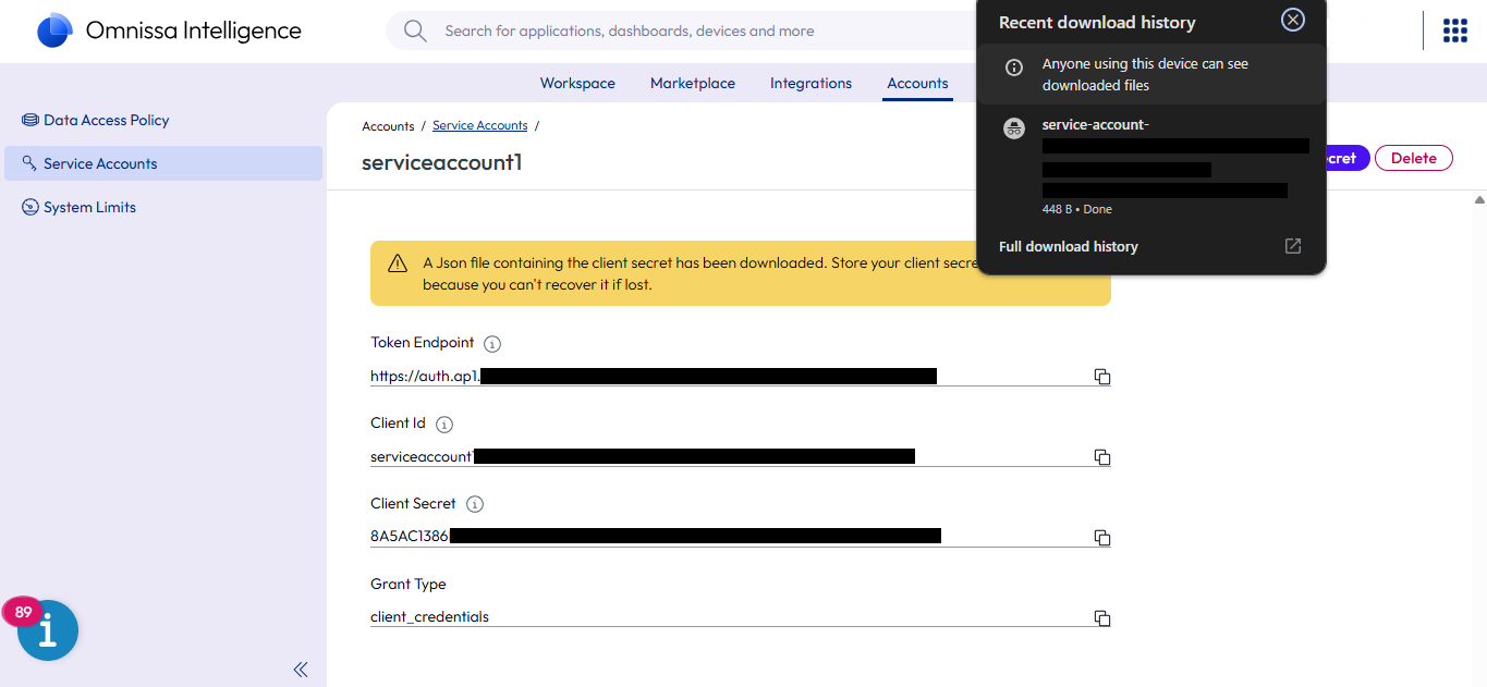 Once the Generate Client Secret button is clicked, the service name with the Client ID and Client Secret will be generated and listed in the Download list (see Figure 6).