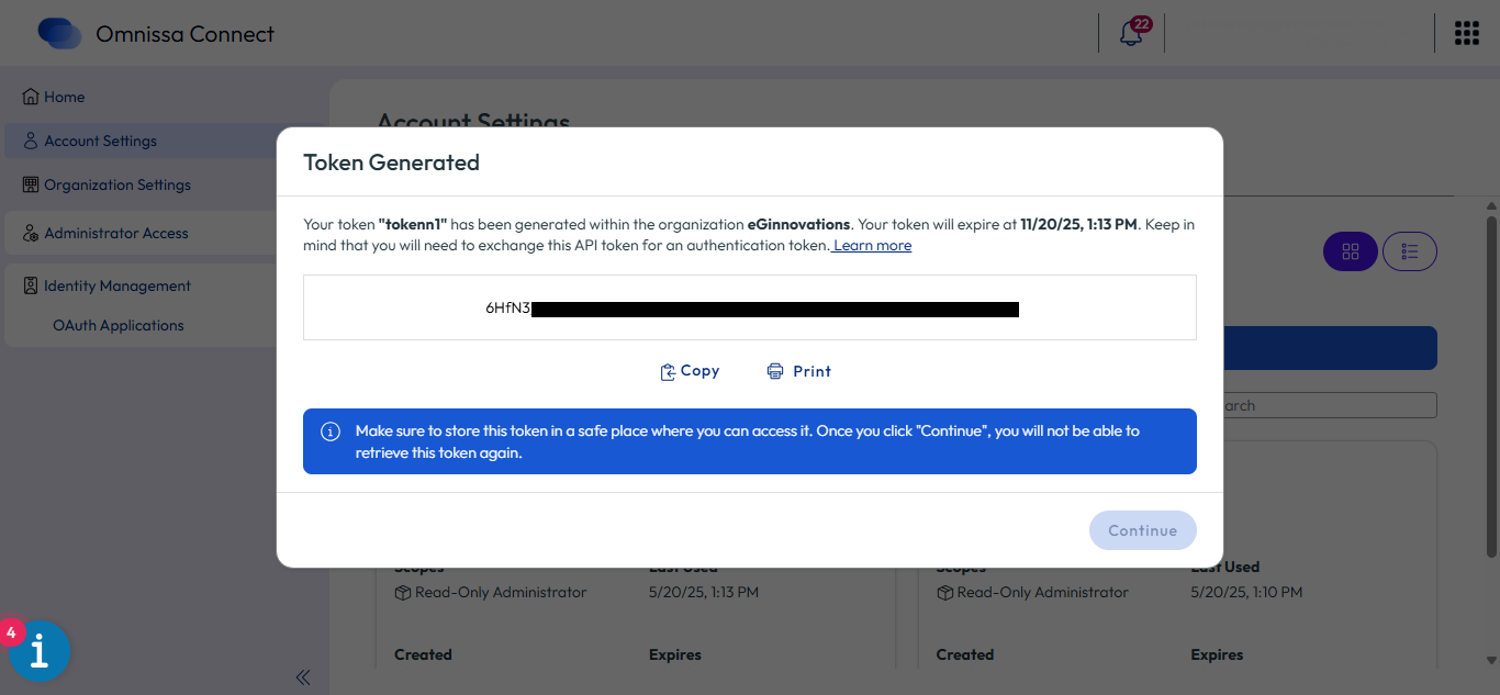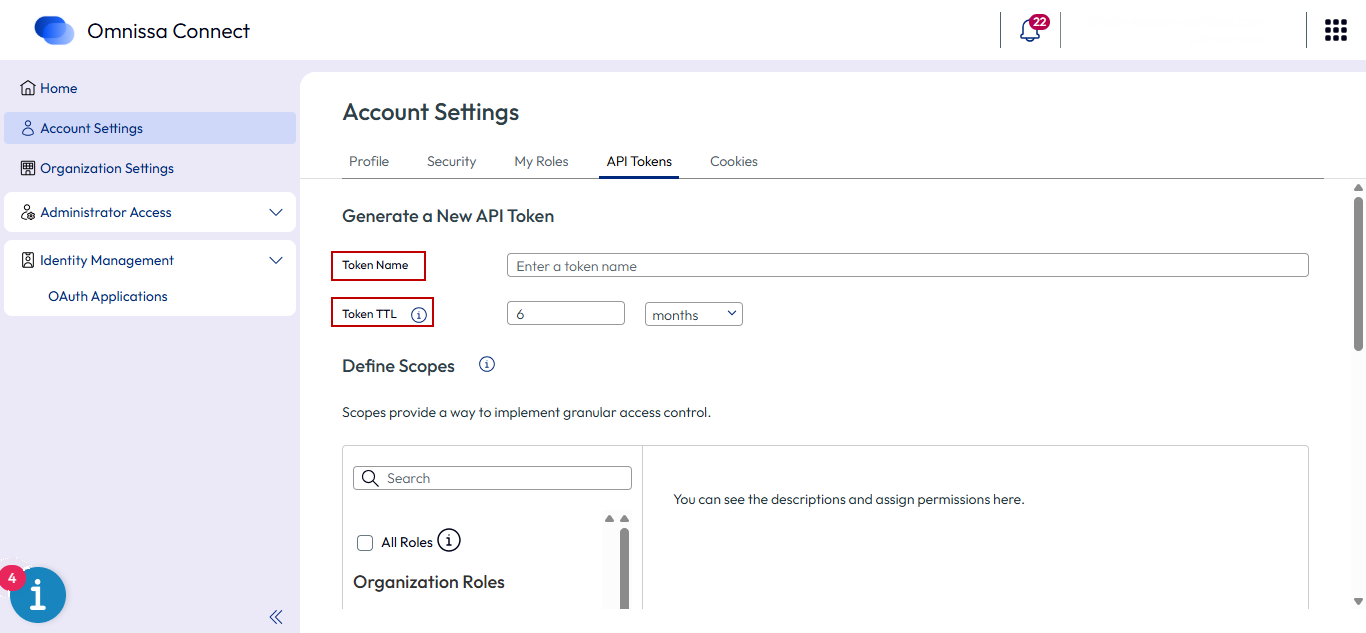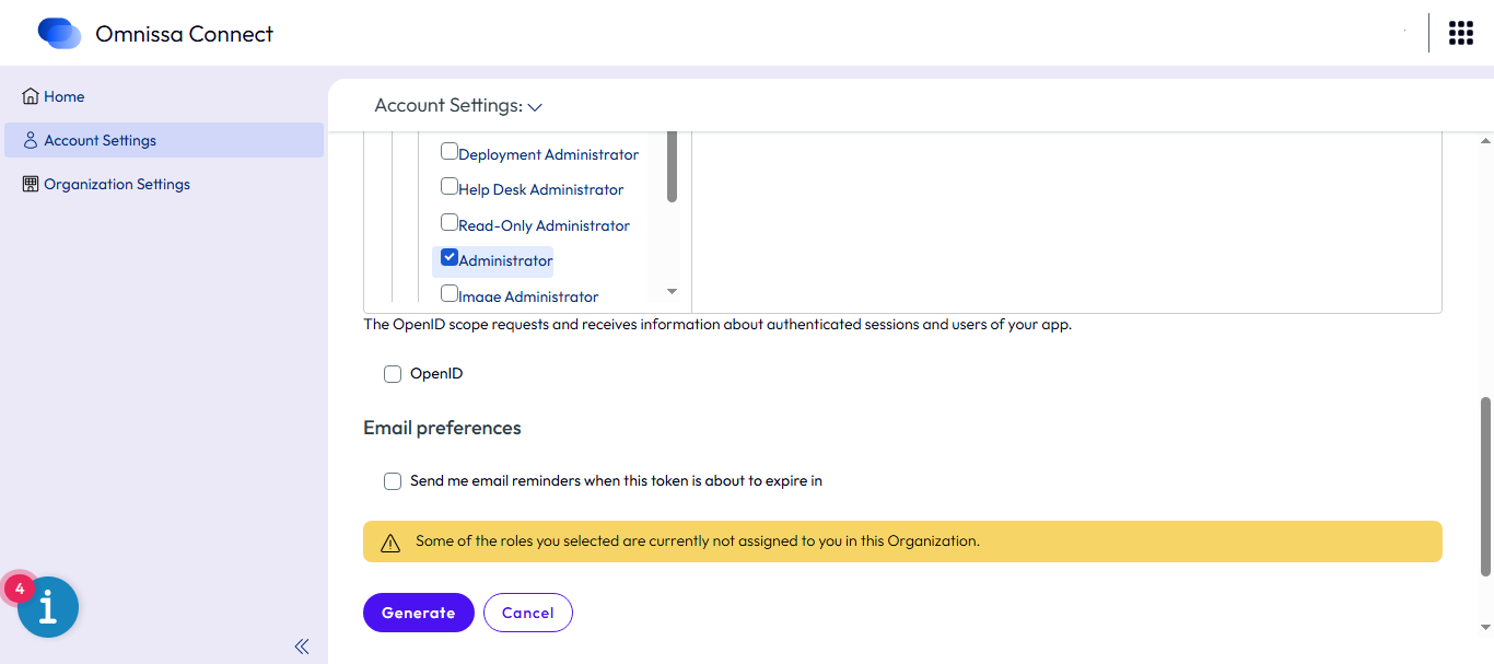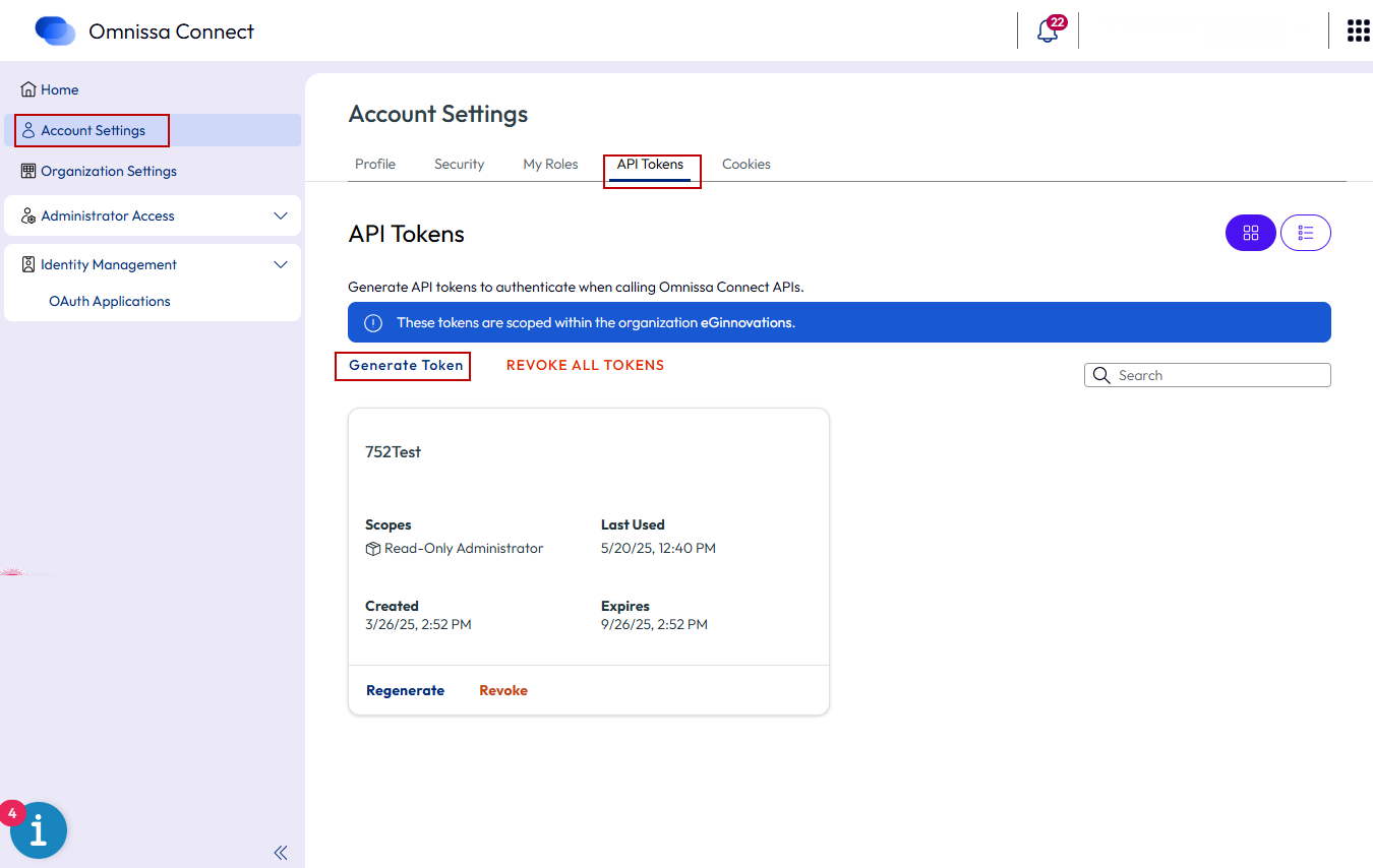 In Omnissa Connect console, select Account Settings menu option from the left panel and it will be navigated to Account Settings page. In the Account Settings page, select API Tokens tab and click the Generate Token option (see Figure 8).