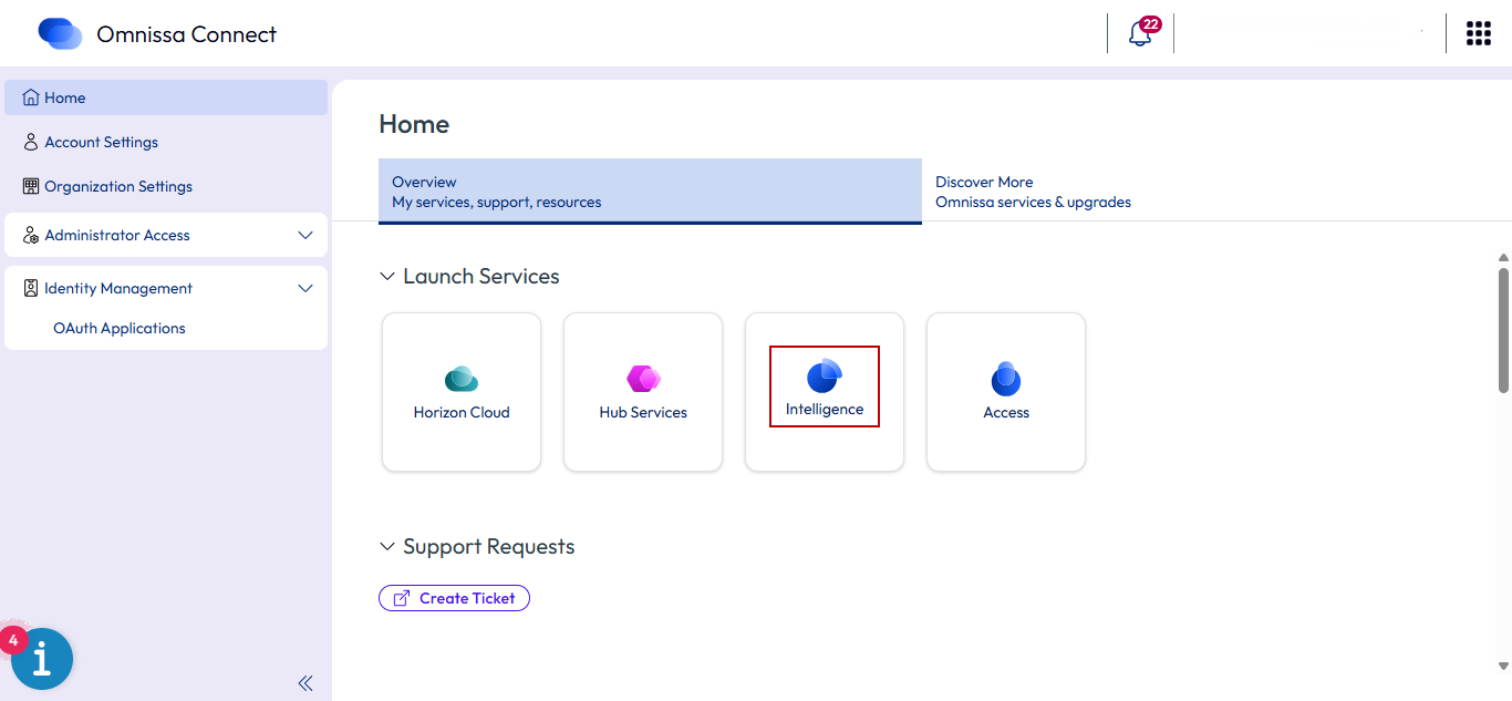 In the Home page of Omnissa Connect console, select Intelligence launch option in the Launch Services section. This Intelligence service offers advanced analytics and reporting capabilities (see Figure 2).