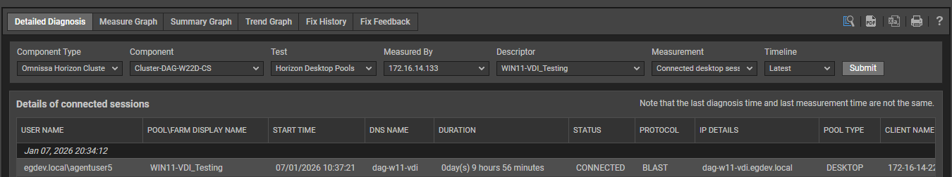 Outputs of the test : One set of results for each desktop pool configured on the Omnissa Horizon Cluster/Pod being monitored