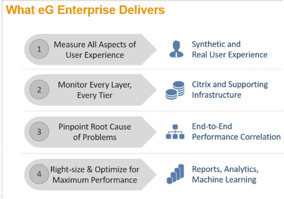 User Experience and Synthetic Monitoring: A key advantage of eG Enterprise is its focus on the Digital Employee Experience (DEX):