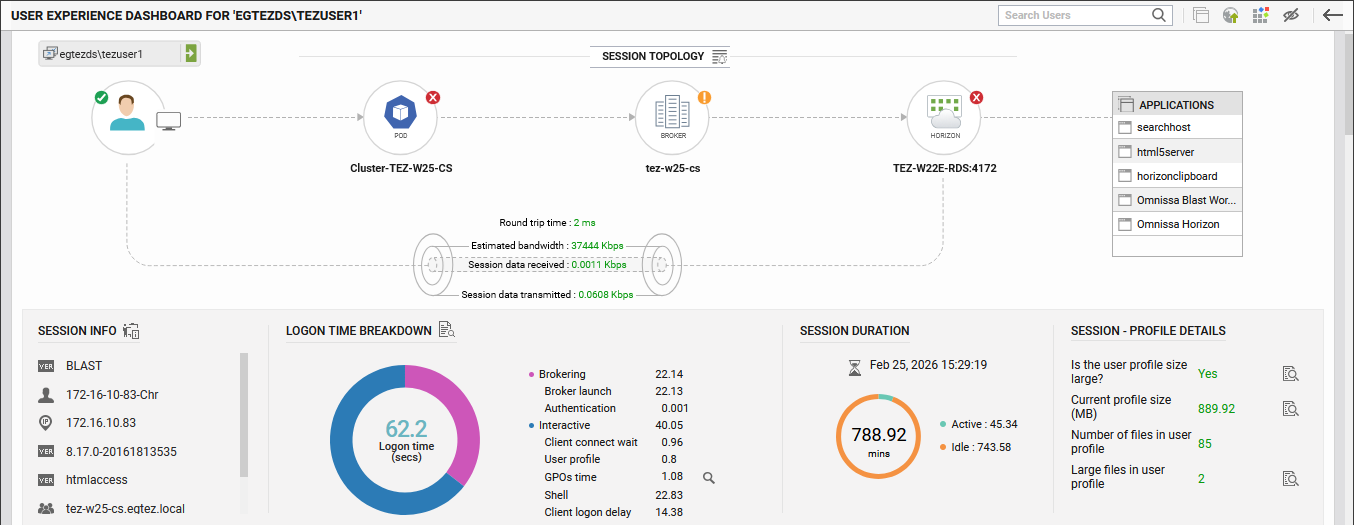 Session Performance — Measures latency, bandwidth consumption, and frame performance for protocols like Blast Extreme and PCoIP to understand session quality.