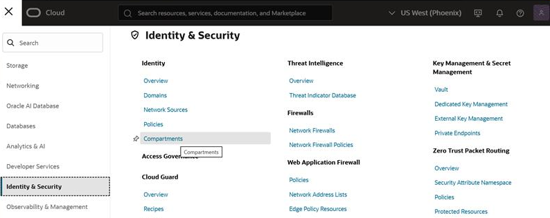 To view the Compartment ID in the OCI Load Balancer, go to Identity & Security -> Compartments (see Figure 1).