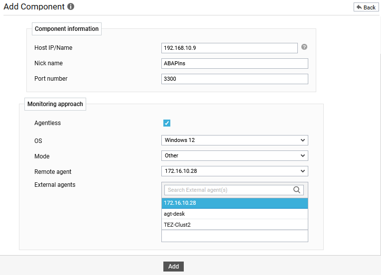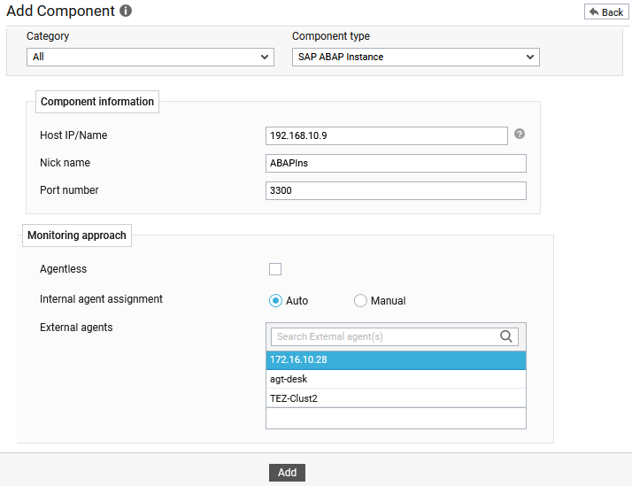- In case you are monitoring a SAP ABAP Instance in an agent-based manner, just pick an external agent from the External agents list box and click the Add button to add the component for monitoring.